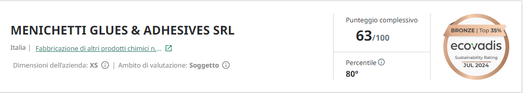 Menichetti se encuentra en el percentil 80 de las empresas evaluadas: esto significa que su impacto en sostenibilidad es más positivo que el del 80% de las empresas que han realizado informes de EcoVadis. Tras esta puntuación, Menichetti recibió la insignia “Bronce”, que está dedicada al 35% de empresas con las mejores puntuaciones en el último año.